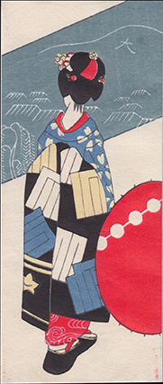 Pochibukuro are small envelopes for gifts of money. These were presented to children on New Year and to adults on celebratory occasions. Although the artist is often not identified, several well known Meiji period and shin-hanga artists created designs for these ephemera. Themes included many of the same topics characteristic of woodblock prints including landscapes, kabuki, and portraits of women. As can be seen in the images below, a popular theme was the portrayal of a Maiko from behind highlighting her high fashion kimono. Pochibukuro were often produced with high printing standards which might include the use of metalic pigments. This gallery features pochibukuro that were mostly created between 1910 and 1940.