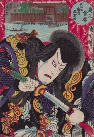 Toyohara Kunichika (1835-1900) was an Ukiyo-e woodblock print artist who produced prints in the Edo and Meiji periods. He was a pupil of Utagawa Kunisada. Kunichika specialized in kabuki actor portraits (yakusha-e). Actor names and roles will be added for these prints as they are identified.