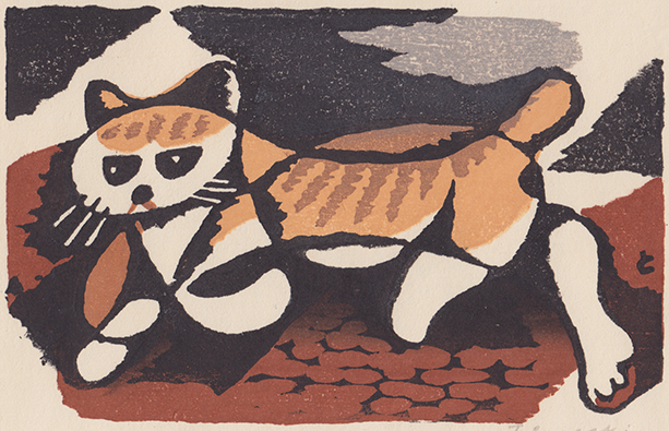 Inagaki Tomoo (1902-1980) is best known for his prints of cats, although he also produced prints with other imagery including landscapes and flowers. Initially self-taught, he later attended commercial and advertising art schools. He opened his own commercial design studio but the business failed due to WWII, However, the post-war market associated with occupying forces allowed him to thrive selling the works that he is now known for.