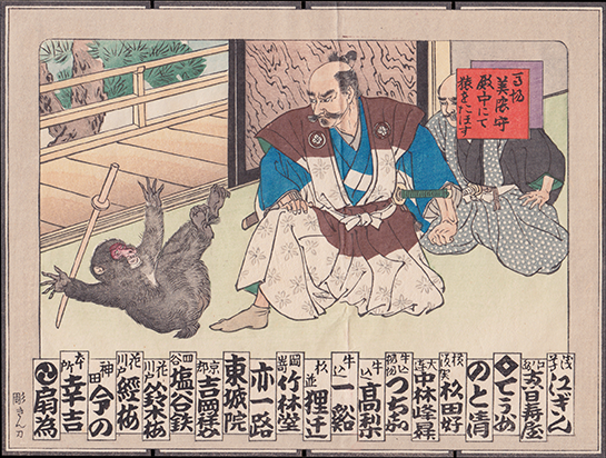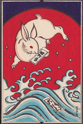 This group of senjafuda by an unidentified artist are from the series Twelve Training Zodiac Signs and was created for a senjafuda colleting club, the Toto Nobi Association located in Chiyoda City. The date of the set has not been determined but appears to be related to the year of the rabbit. The image for monkey had a hole near the lower central margin that has been digitally “repaired” for presentation here..