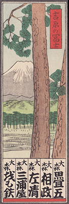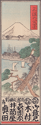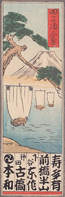 This set of 18 senjafuda depicts Mount Fuji from views along the Tokaido road. The scenes do not appear to correspond to any of the famous Tokaido Road series by Hiroshige. The set is undated. The artist is currently unidentified.