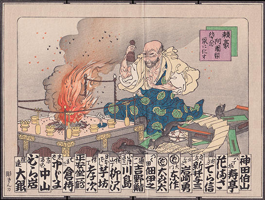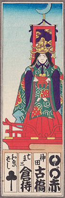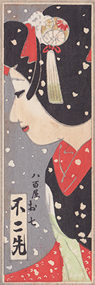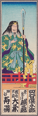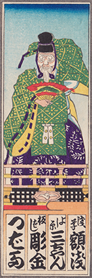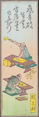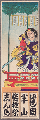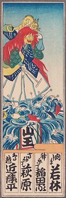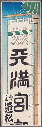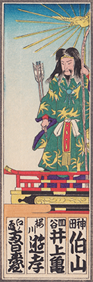 Senjafuda translates to “thousand shrine tags.” Their original purpose was as votive slips that visitors affixed to shrine and temple gates and buildings. Initially, senjafuda were simple designs limited to the name of the worshipper. However, as visits to multiple shrines became popular, senjafuda came to depict more complex imagery. Senjafuda clubs were also established to admire, exchange, and collect these miniature prints. The senjafuda in this collection depict shrine visits, kabuki actors, bunraku theater, deities and a few other topics. Images here are depicted without margins.