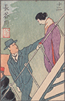 This set of 12 prints is by a yet to be identified artist. Interestingly, the same seal and calligraphy appear on the above set by Hasegawa Sadanobu III. This likely refers to the publisher rather than the artist who created these images.