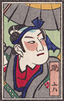 The following matchbox prints are from the set Selection of Famous Kabuki Roles. The series identifies the theatrical role but not the specific actor or the play in which the character appeared. Each print also identifies the sponsor who supported the print production. The publisher and carver of this set has not been identified. The majority of translations are provided via a collection of similar prints at Mokuhankan which also provides the titles of plays that the roles likely derive from.
